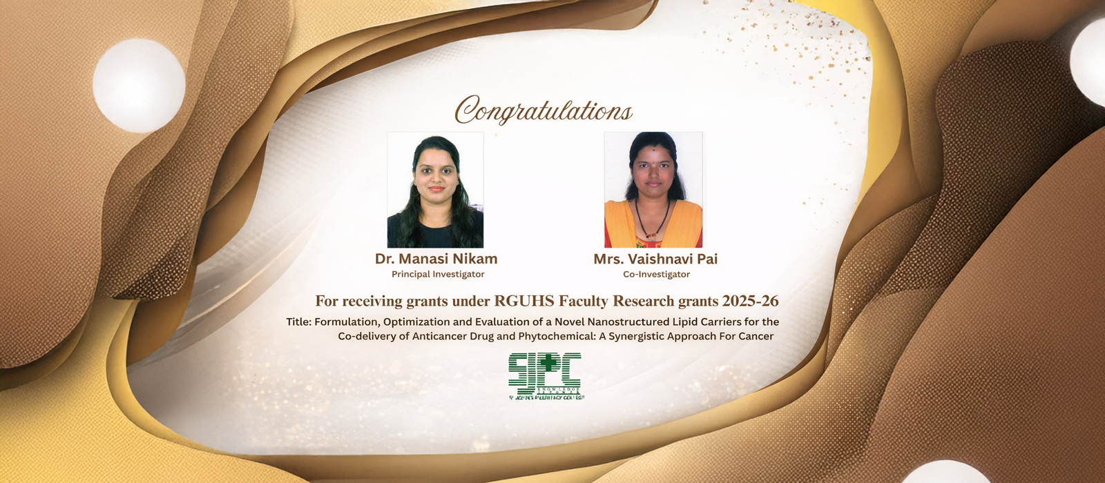 Heartiest congratulations to Dr. Manasi Nikam (PI) and Mrs. Vaishnavi Pai, Department of Pharmaceutics for securing the prestigious RGUHS Faculty Research Grant of ₹7,00,000 for the academic year 2025–26.